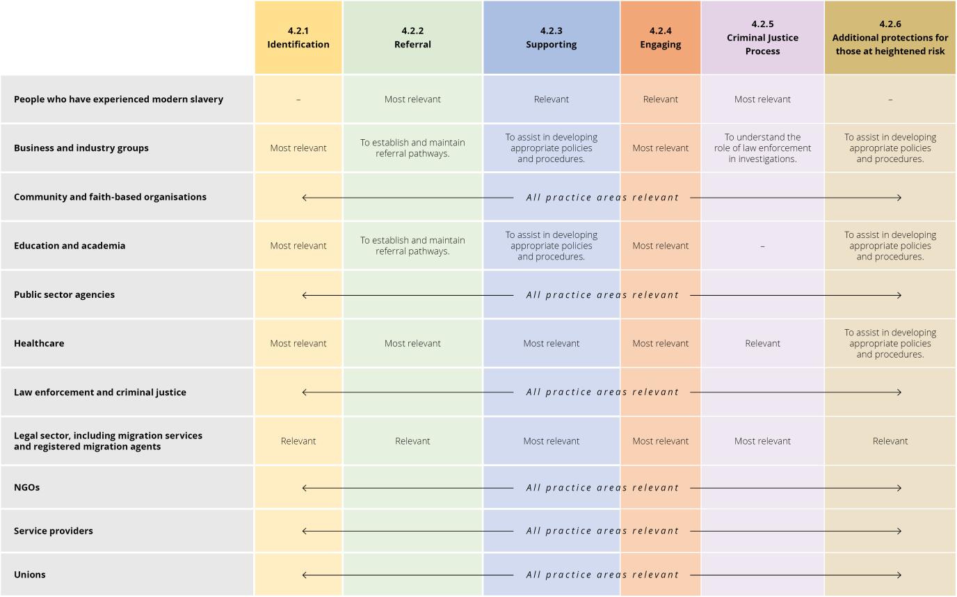 Section 4.2 has been broken down into 6 Practice Areas and provides guidance on how to work with people who have experienced modern slavery at different stages of a person’s journey. Some Practice Areas may be more relevant to certain stakeholders than others. Refer to the mapping stakeholders to relevant Practice Area for more information about how Section 4.2 may apply to you.